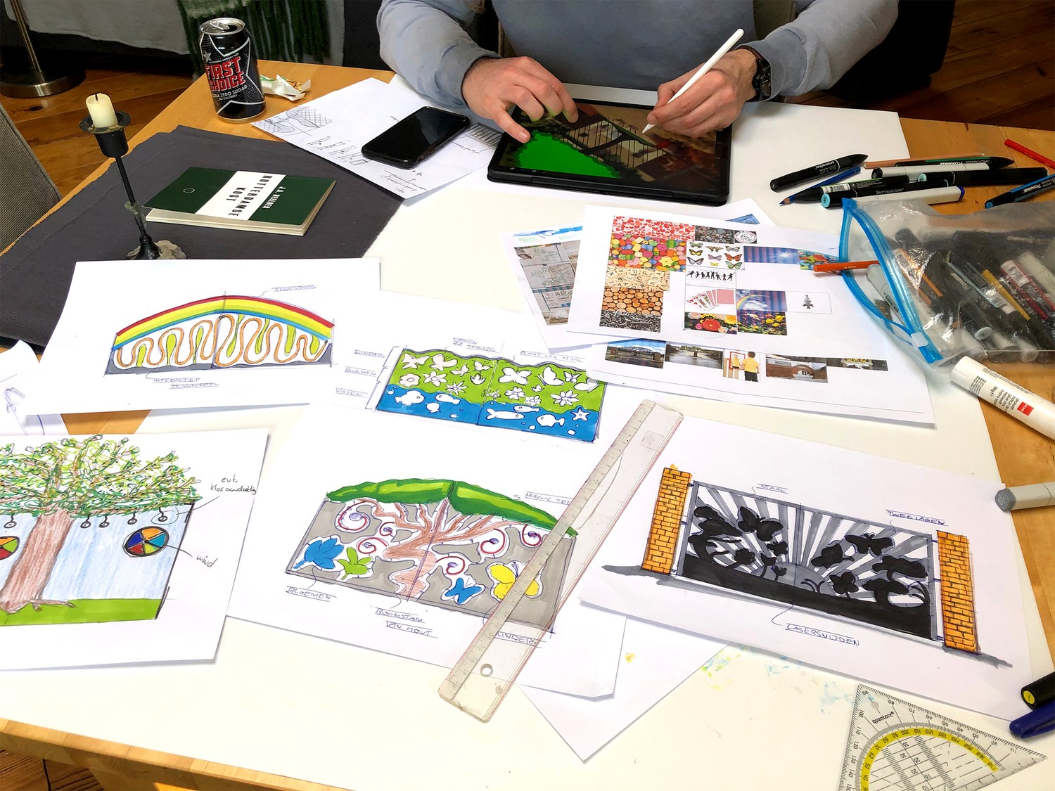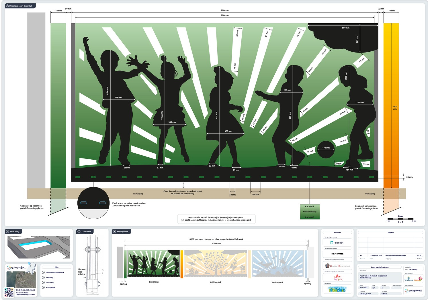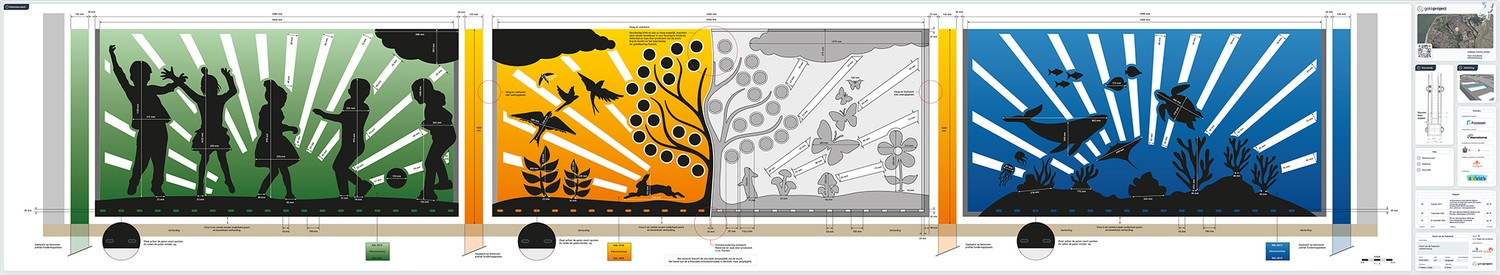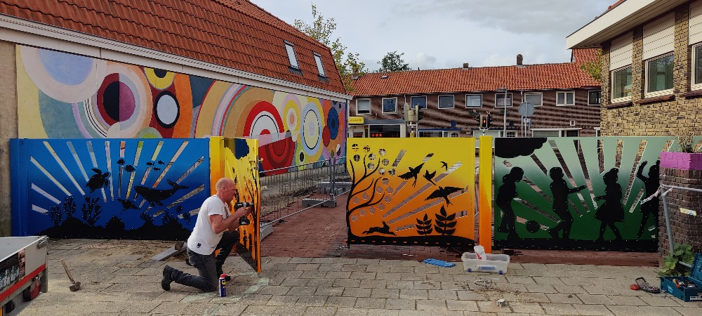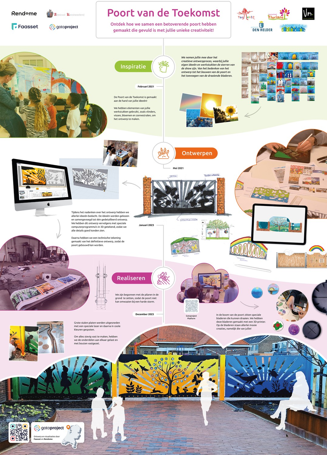 Centraal in dit project stond co-creatie met de leerlingen. Het ontwerpproces is van begin tot eind samen met de kinderen doorlopen. Hun ideeën, tekeningen en verbeelding vormden de basis voor het uiteindelijke ontwerp. Dit is terug te zien in de speelse vormen en symboliek, zoals zonnestralen, bloemen, vissen en spelende kinderen, elementen die de levendigheid van de kinderlijke verbeelding weerspiegelen.